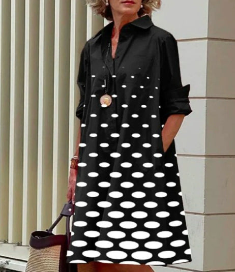 Fashion Polka Dot Print Shirt Collar Long Sleeve Pocket Mid-length Dress
